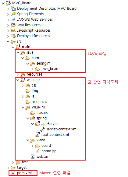 pom.xml : Maven 설정 파일, Maven은 프로젝트 관리 도구로 필요한 라이브러리를 pom.xml에 정의하면 자동으로 라이브러리가 다운받아진다.